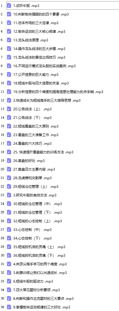 1.试听牛股.mp3 2.快速成长为短线高手的三大指导思想.mp3 3.研究牛股的有效方法.mp3 4.向顶尖高手学习的两个维度.mp3 5.刻意训练让我们以光速成长.mp3 6.短线牛股的驱动力.mp3 7.四大常见题材分析要领.mp3 8.判断和操作主流题材的三大要点.mp3 9.掌握板块运动规律的三大好处.mp3 10.判断板块强弱的的四个要素.mp3 11.总体市场的三大定律.mp3 12.板块运动的三大核心规律.mp3 13.龙头战法原理.mp3 14.操作龙头战法的五大步骤.mp3 15.龙头战法的最佳出场技巧.mp3 16.不同运行模式龙头股的实战案例.mp3 17.公开信息的巨大威力.mp3 18.短线牛股与四大信息的关系.mp3 19.分析信息的四个维度和提高信息处理能力的杀手锏.mp3 20.公告战法(上).mp3 21.公告战法(下).mp3 22.短线看盘的三大原则.mp3 23.看盘的三大准备工作.mp3 24.看盘的六大技巧.mp3 25.快速提升看盘能力的训练方法.mp3 26.复盘的好处.mp3 27.复盘四大主要内容.mp3 28.龙虎榜和交割单.mp3 29.短线仓位管理(上).mp3 30.短线的仓位管理(中).mp3 31.短线的仓位管理(下).mp3 32.短线的心态控制(上).mp3 33.心态控制(中).mp3 34.心态控制(下).mp3 35.短线投机活的灵魂(上).mp3 36.短线投机活的灵魂(下).mp3